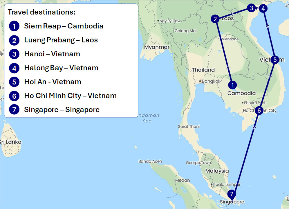 Over the course of three weeks, we’ll weave through the ancient wonders of Angkor Wat in Cambodia, soak in the serene landscapes of Laos’ Luang Prabang, and delve into the vibrant cities of Hanoi, Hoi An, and Ho Chi Minh City in Vietnam.
